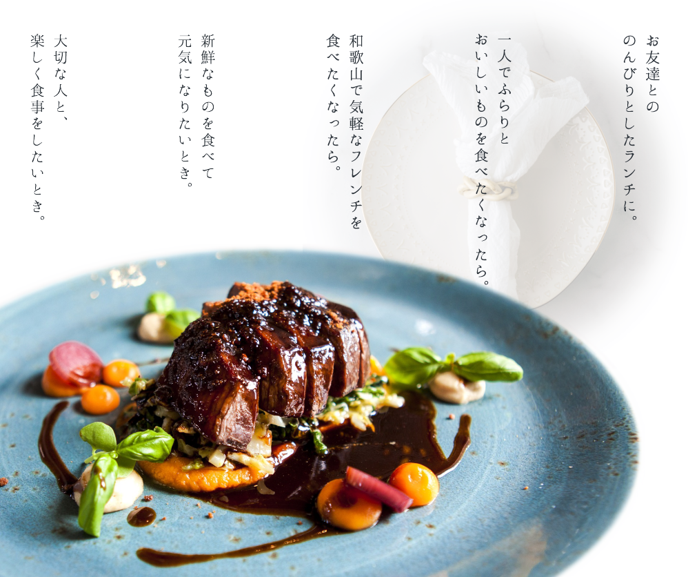 本場フランスでの経験や、全国的なベーカリーレストランで総料理長を務めた経歴のあるシェフが、ふるさとに戻ってきた理由。それは、和歌山の食材がすばらしいから。日本一のタチウオ漁獲量の港で水揚げされるタイ、ハマチ、アジ、エビ。近所ののどかな畑でとれる野菜、タケノコなどの山菜。有田みかんを始めとするフルーツもたくさん実り、フレンチに使う食材がほぼすべてそろいます。 良い食材は調理時間が早く、香りもいいし甘みもたっぷり。このすばらしい食材を、地元の人にこそ味わってほしくて、腕によりをかけたフレンチに仕上げました。